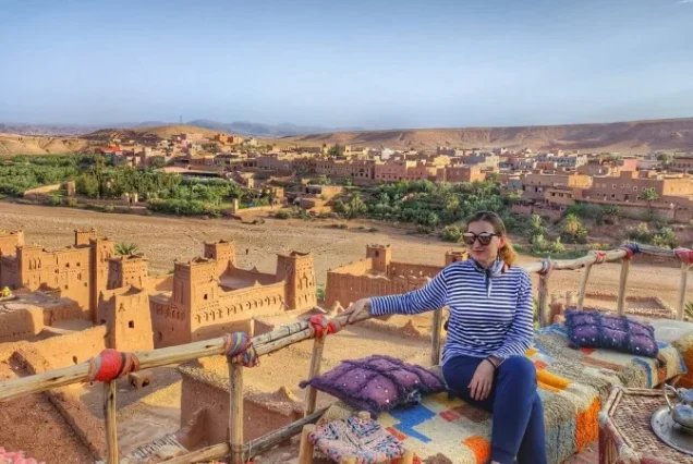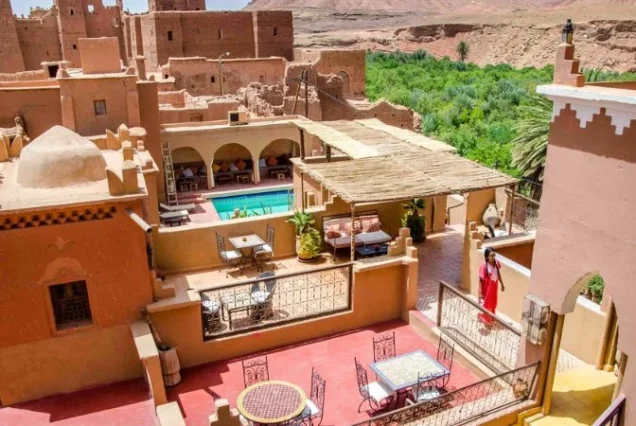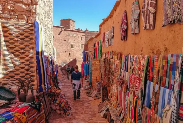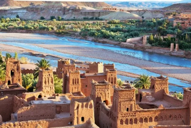 The journey continues north through Agdz and across the Anti-Atlas Mountains via the Tizi n’Tinifift Pass. Arrive at the Kasbah Ait Ben Haddou, an ancient 11th-century fortress and UNESCO World Heritage Site, known for its unique architecture and cinematic history.