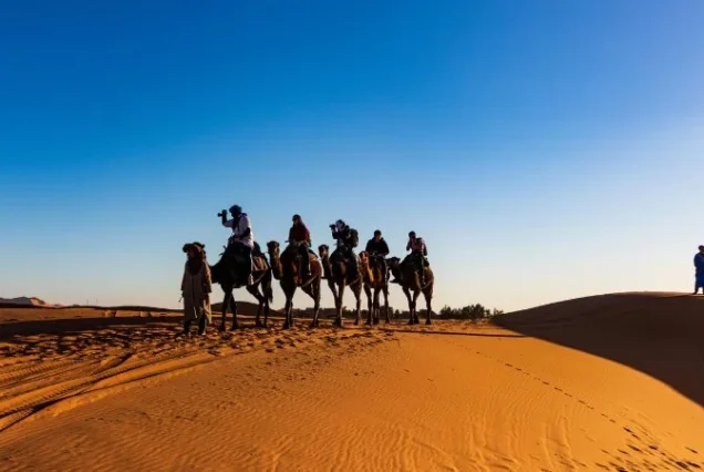 After breakfast, we depart from Fez for the Merzouga desert, passing through Ifrane (the "Switzerland of Morocco"). There, you'll have 20 minutes to take photos and stroll through the town square. We then arrive at the forests of Azrou, home to wild monkeys. This will be a great opportunity to photograph Moroccan nature. We'll have lunch in the Berber village of Zaida. We continue through the Middle Atlas Mountains, enjoying the scenery of Midelt until we reach the small village of Rich. We then proceed to the Ziz Valley, where we'll make a panoramic stop for photos. In the afternoon, we arrive in Erfoud, where we begin to experience the Saharan air with the Tafilalet oasis. We continue to Merzouga, where we switch to camels for an overnight stay in traditional Berber tents (haimas) in the Erg Chebbi desert.