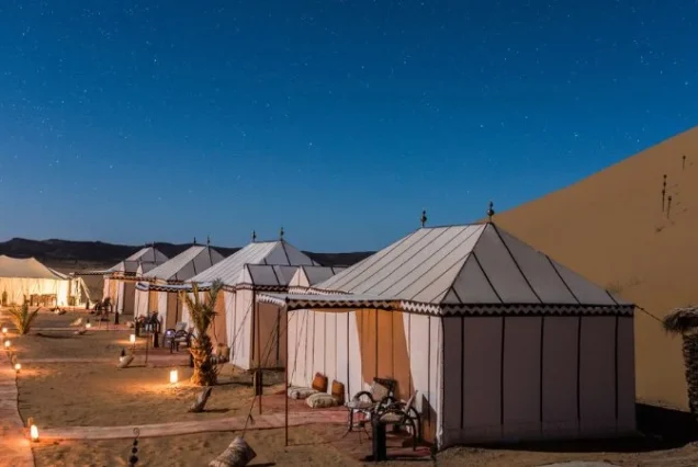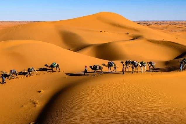 After breakfast, drive through the Tinghir Oasis to explore the Todra Gorges, a stunning canyon popular among rock climbers. Continue toward Erfoud, known for its fossil workshops, before reaching Merzouga. Switch from car to camelback and ride through the golden dunes at sunset. Dinner, live Berber music, and overnight in a luxury desert camp.